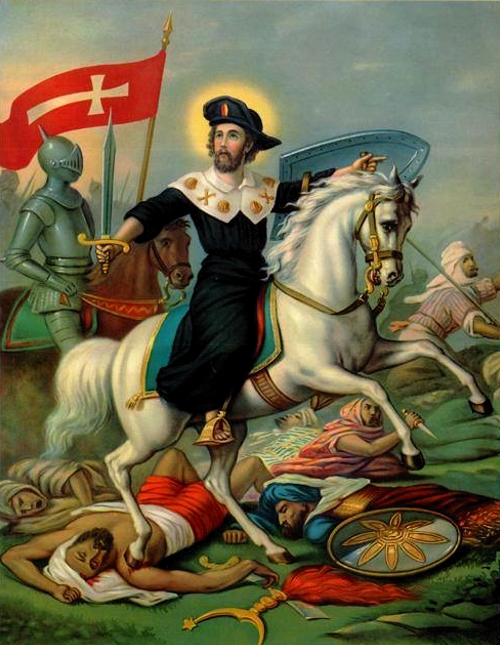Los Hechos de los Apóstoles relatan que estos se dispersaron por todo el mundo para llevar la Buena Noticia. Según una antigua tradición, Santiago el Mayor se fue a España, primero al territorio de Galicia. Allí estableció una comunidad cristiana, y luego a la ciudad romana de César Augusto, hoy conocida como Zaragoza. La leyenda Aurea cuenta que las enseñanzas del Apóstol no fueron aceptadas y que solo siete personas se convirtieron al cristianismo. Las cosas cambiaron cuando la Virgen María, que aún vivía en carne mortal, se le apareció en esa ciudad; esta advocación es conocida como la Virgen del Pilar. Desde entonces la intercesión de la Virgen hizo que se abrieran los corazones a la evangelización de España.