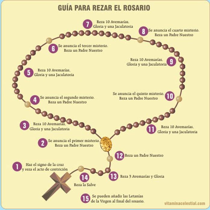 2. En función del día de la semana se eligen los misterios a meditar. Se anuncia el misterio y se reza un Padre Nuestro. Luego, ayudado por las cuentas del rosario, se rezan diez Avemarías y finalmente un Gloria.